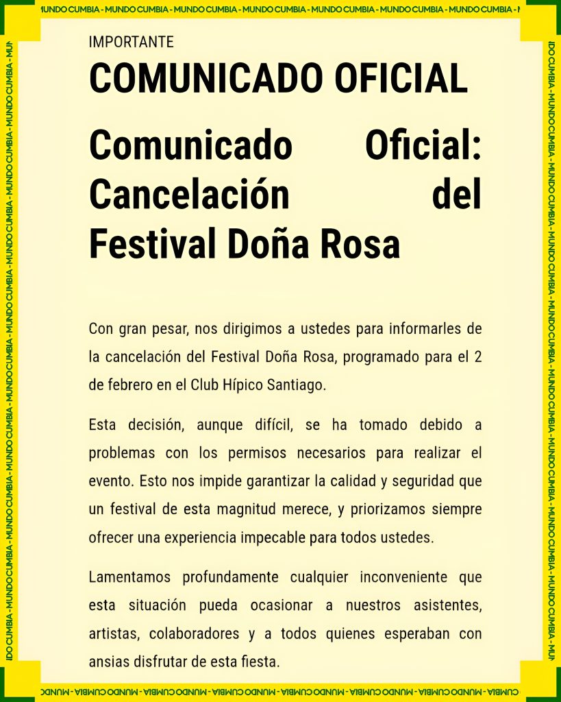 A pocos días de ‘El Festival de la Doña Rosa’ -que estaba fijado para el 02 de febrero- la organización del evento informó la suspensión del show que iba a reunir a grandes exponentes de la cumbia en el Club Hípico de Santiago, como Santaferia, Noche de Brujas y La Combo Tortuga.