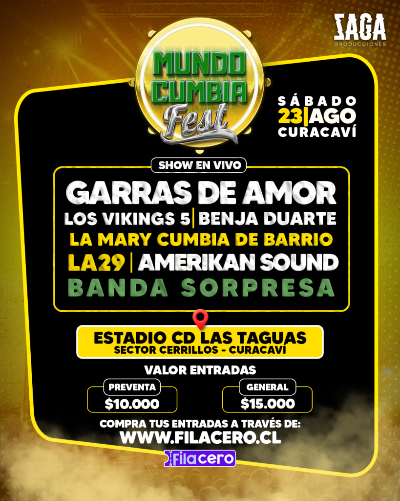 Garras de Amor, Los Vikings 5, Benja Duarte, La Mary CDB, La 29 y Amerikan Sound son los primeros confirmados que estarán el sábado 23 de agosto en el Estadio del Club Deportivo Las Taguas de Curacaví.