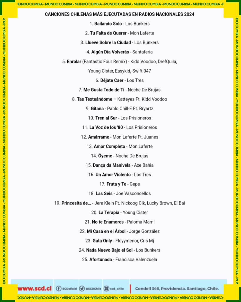 Como cada año, la Sociedad Chilena de Autores e Intérpretes Musicales (SCD) liberó el listado de canciones 25 más reproducidas en las radios durante el 2024, haciendo una radiografía de los artistas nacionales lo que más sonaron en los medios.